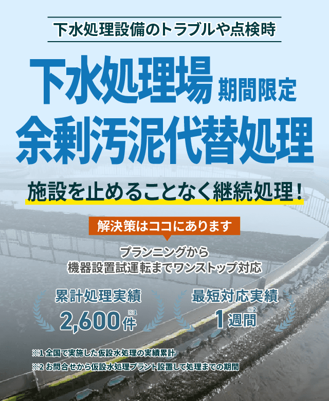 下水処理場の排水設備トラブルや点検時の余剰汚泥を稼働を止めずに処理・減容化